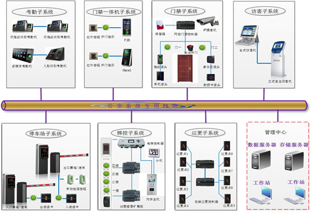 公安局智能化管理系统:支持门禁、考勤、消费、停车、通道、访客、会议签到等,系统管理权限分区域管理。