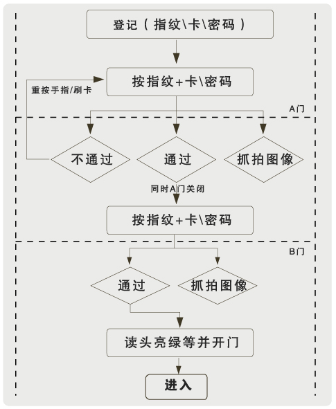 银行AB二道门 开门人员到A门口,在读卡器上打指纹或者刷卡,即可开启A门,同时摄像机联动抓拍,在人员将A门关闭后即可验证通过B门。