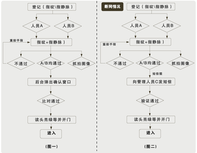 银行金库门为重点安全防范区域,需要多人监督验证的情况下打开。为此需采用多人验证开门,指静脉、指纹等模式,如:人员A指静脉+人员B指静脉+后台中心管理人员验证,方可开启金库门,以防止不法分子用非法途径获得开门权限。