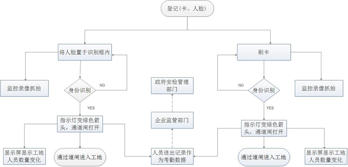 多种验证方式 系统采用刷卡验证或者人脸比对验证方式进出,既能避免工人忘带卡时无法进入,又能防止下班时脸上有异物而无法验证出门,方便、快捷、实用;