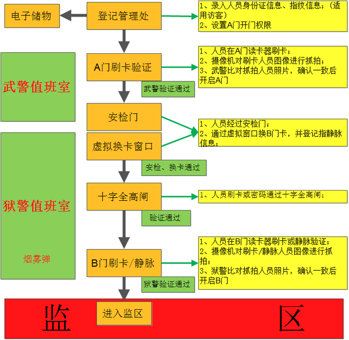 B门进出流程B门由狱警人员值班管理,出入流程同A门一样需要值班狱警确认后才能放行。
