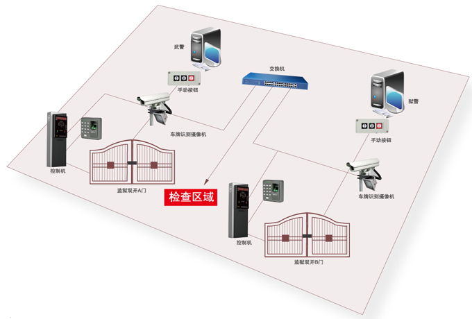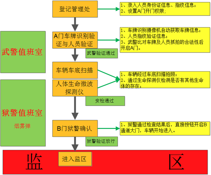 车辆登记流程车辆进出监区必须由干警带领,首先驾驶员必须至狱政科进行登记,采集生物识别特征,并与车辆信息、带领干警进行绑定,确保进出的安全性。车行AB门采用AB门互锁工作模式,利用控制电动门的电机来实现互锁工作模式。