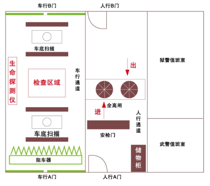 车辆B门进出流程 车辆获得检查通过后,由狱警确认打开B门,车辆方可驶入监区。
