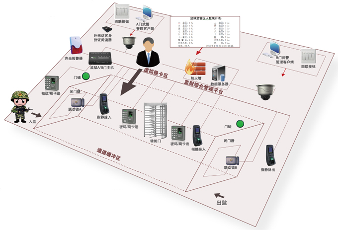 A门进出流程当需要带犯人进入监狱区的时候,我们首先要经过一个严格防守的AB门,AB门是监控区防守*为严密的两道门,分别由武警和干警来把控,当执勤人员在A门上通过卡加指纹验证成功后,相关的刷卡数据和摄像头联动抓拍的图片会及时上传到武警值班室服务器,武警查看监控图像比对一致后,点击软件“放行”后才能开启A门。